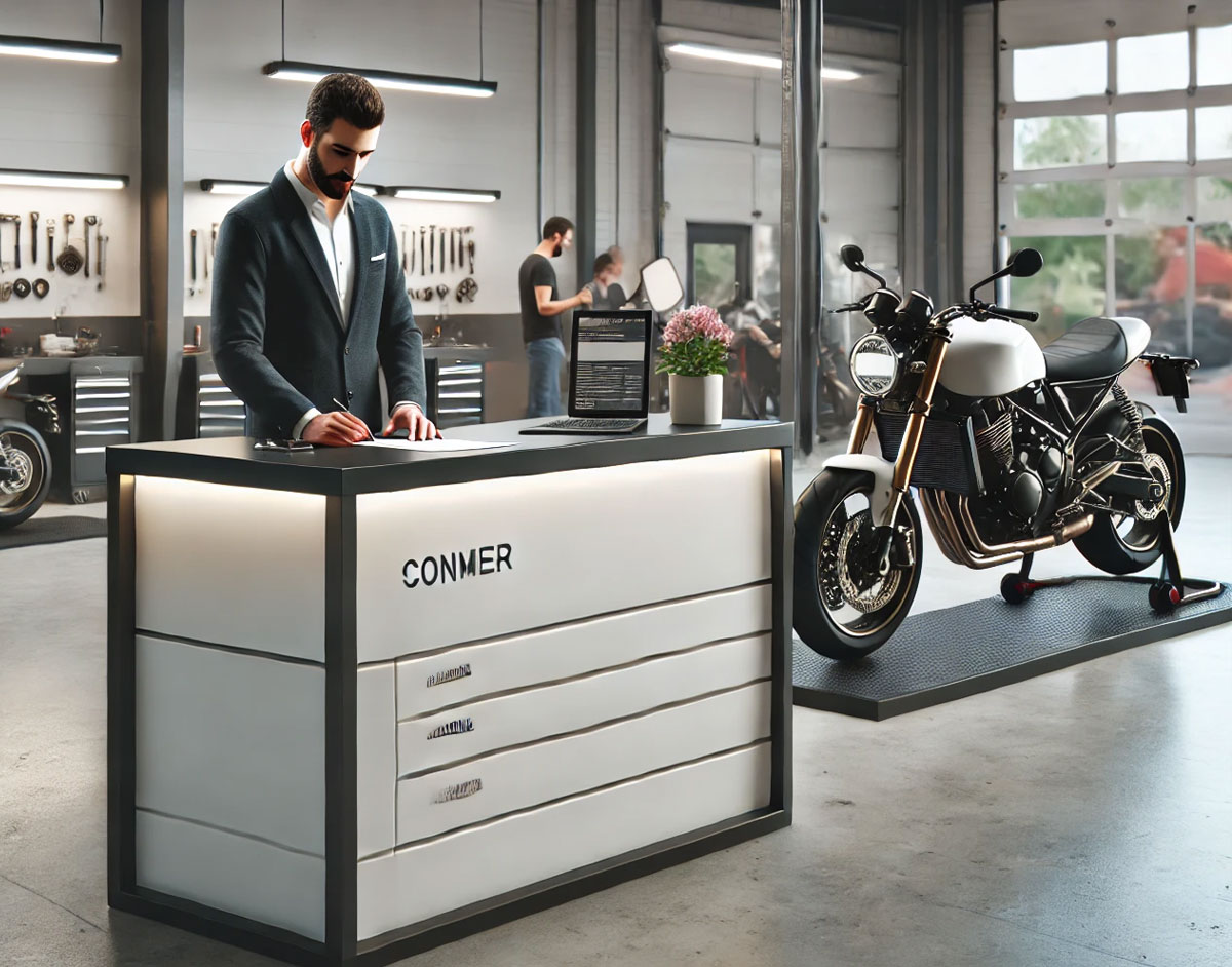 In secondo luogo, è necessario un bancone in cui il Cliente possa firmare stando in piedi; l’ideale sarebbe avere lo spazio per posizionare la moto accanto. Il Cliente, non parla il linguaggio tecnico del “meccanichese”. È fondamentale, infatti, non scendere nei tecnicismi, ma parlare solo di “vantaggi”, molto più comprensibili.