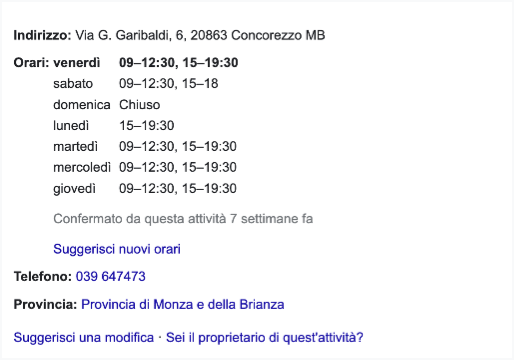 Al giorno d’oggi i clienti si affidano agli orari di apertura e recapiti mostrati sulla scheda Google. Se trovano l’attività chiusa o non raggiungibile telefonicamente, è probabile che si rivolgeranno a un concorrente. Questa esperienza negativa potrebbe causare la perdita di clienti abituali.